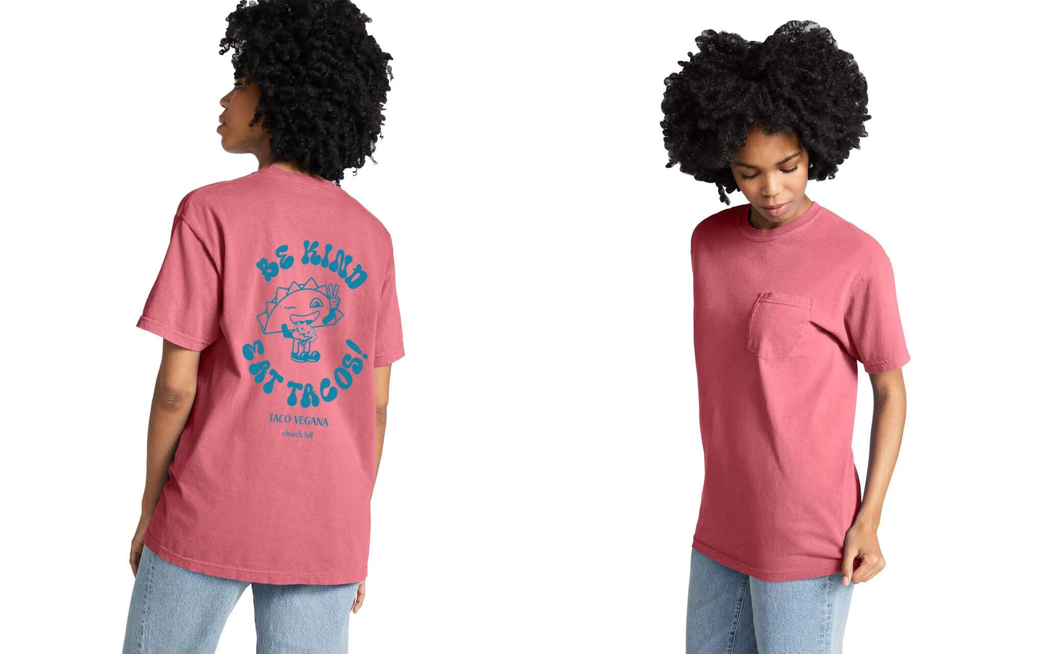All remains the same with the mask itself, but we changed the banner so the overall impression can be larger on the shirts and the text on it is more legible. We also slightly changed the text underneath so it matches the layout of the text below on the EAT TACOS one. And we’re showing it to you on a blue shirt from Comfort Colors instead of that gray in the original mock-up.